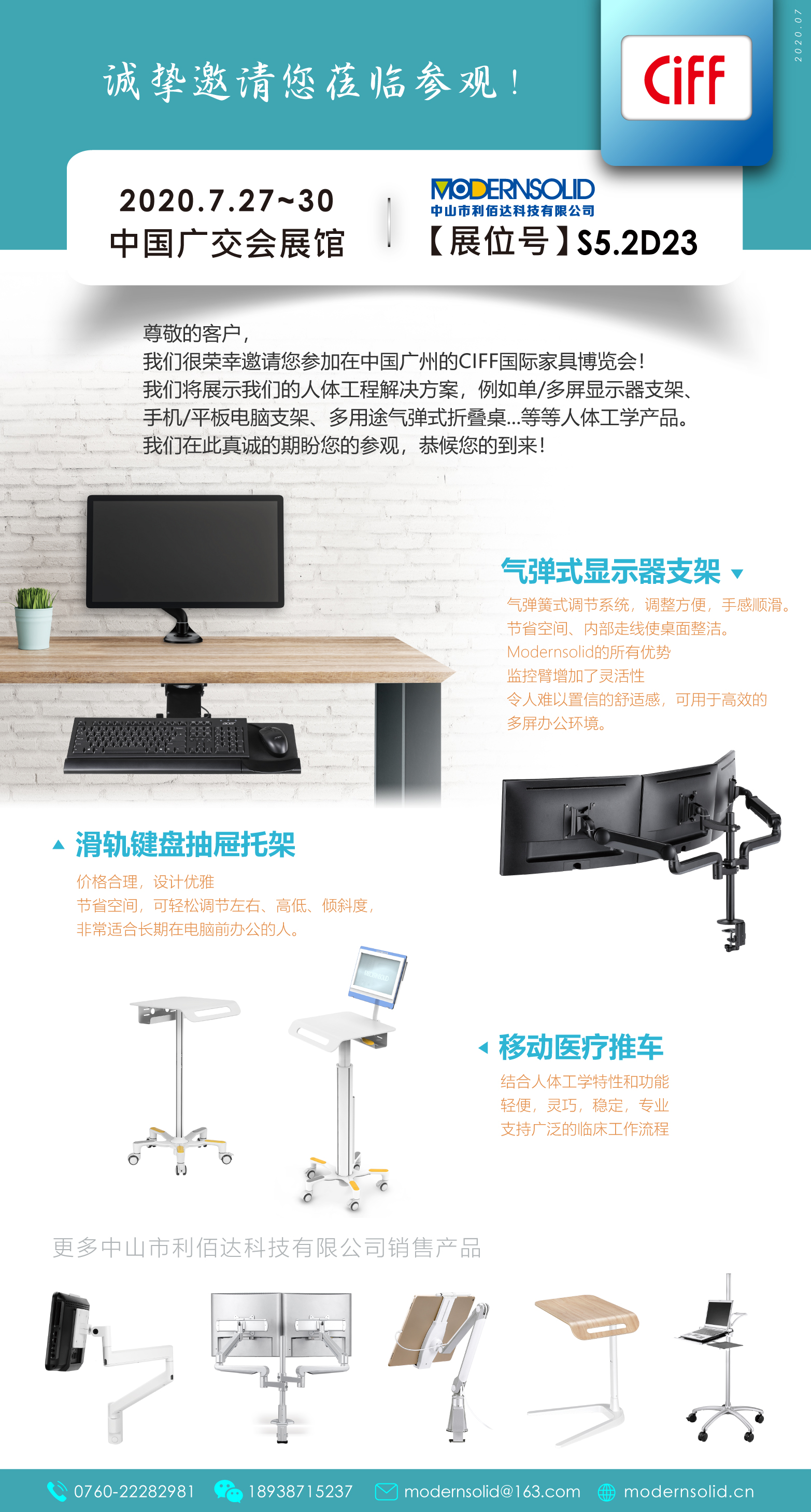 我们很荣幸邀请您参加在中国广州的CIFF国际家具博览会!我们将展示我们的人体工程解决方案,例如单/多屏显示器支架手机/平板电脑支架、多用途气弹式折叠桌.等等人体工学产品。我们在此真诚的期盼您的参观,恭候您的到来!